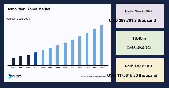 According to StraitsResearch, the global demolition robot market size is valued at USD 299,701.2 thousand in 2022 and is estimated to reach USD 1175615.50 thousand by 2031, growing at a CAGR of 16.4% during 2023-2031.