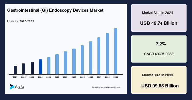 According to StraitsResearch, the global gastrointestinal endoscopy devices market size is valued at USD 49.74 billion in 2024 and is estimated to reach USD 99.68 billion by 2033, growing at a CAGR of 7.2% during 2025-2033.