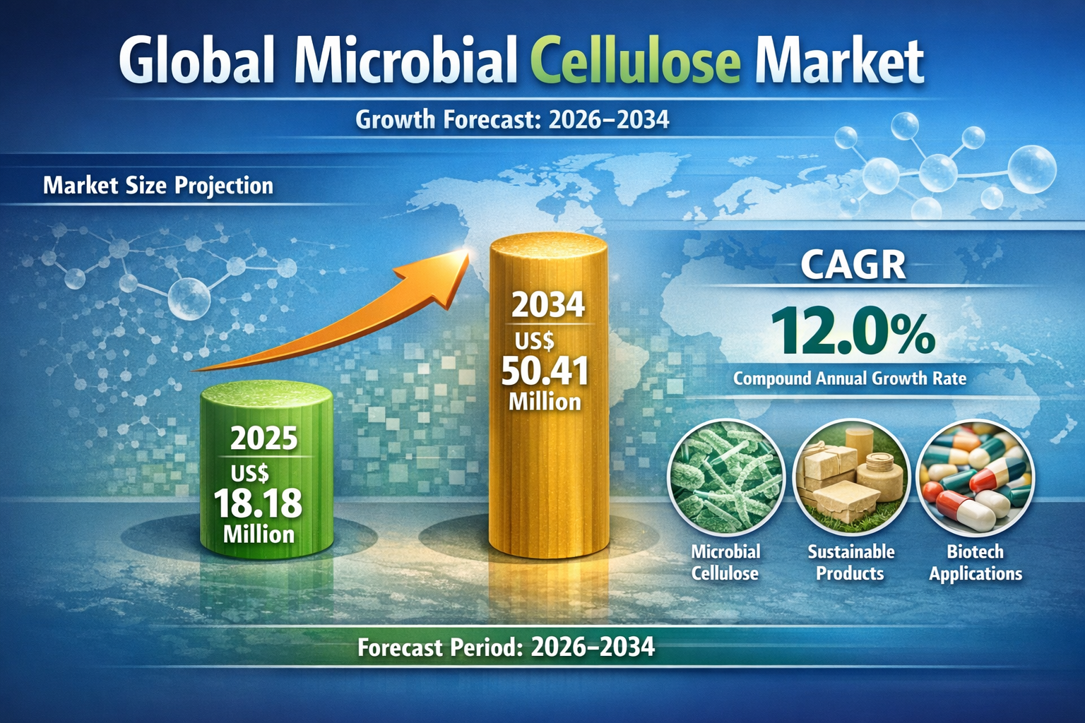 The global Microbial Cellulose Market Demand landscape spans a market moving from US$ 18.18 million in 2025 to US$ 50.41 million by 2034 at 12.0% CAGR during 2026–2034, shaped by a buyer ecosystem that includes food ingredient formulators, sustainable packaging developers, biomedical product manufacturers, and cosmetic brand chemists who collectively pull demand from distinctly different directions but share a common appreciation for bacterial cellulose's combination of natural origin, functional performance, and biodegradability.