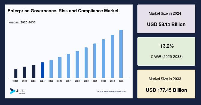 The global Enterprise Governance, Risk, and Compliance (GRC) market is experiencing rapid expansion as organizations increasingly prioritize regulatory adherence, risk mitigation, and operational transparency. According to the latest report by Straits Research, the market was valued at USD 58.14 billion in 2024 and is projected to grow to USD 65.81 billion in 2025, reaching USD 177.45 billion by 2033, registering a robust CAGR of 13.2% during the forecast period. The surge in data breaches, evolving regulatory frameworks, and the growing need for integrated risk management solutions are key factors driving market growth.