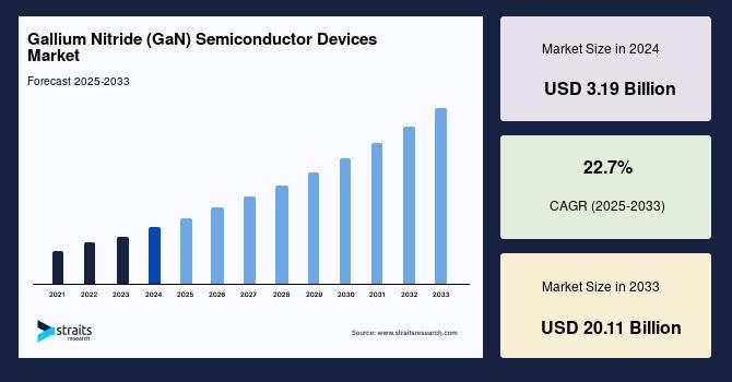 According to StraitsResearch, the global gallium nitride semiconductor devices market size is valued at USD 3.19 billion in 2024 and is estimated to reach USD 20.11 billion by 2033, growing at a CAGR of 22.7% during 2025-2033.
