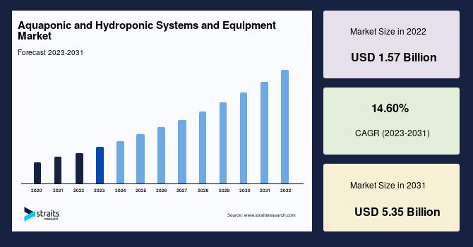 According to StraitsResearch, the global aquaponic and hydroponic systems and equipment market size is valued at USD 1.57 billion in 2022 and is estimated to reach USD 5.35 billion by 2031, growing at a CAGR of 14.6% during 2023-2031.